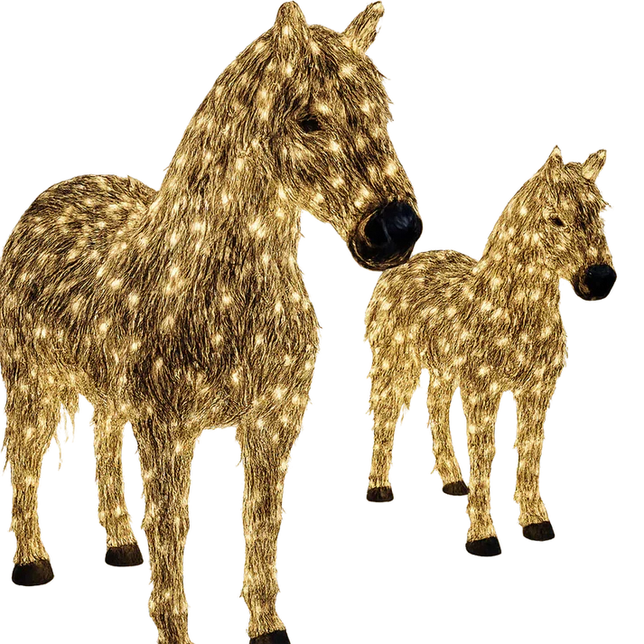 Veredeln Sie Ihren Zugang mit unserem leuchtenden Duo, das die stille Kraft eines Pferdes und die Zärtlichkeit seines Fohlens einfängt. Hunderte warmweißer Lichtpunkte zeichnen tagsüber eine skulpturale Silhouette und verwandeln Ihren Außenbereich nach Einbruch der Dämmerung in eine unwiderstehlich einladende Szenerie. Wir haben es wetterfest und langlebig ausgeführt – für eine stilvolle Atmosphäre das ganze Jahr über in Gärten, Einfahrten, auf Veranden und weitläufigen Anwesen.